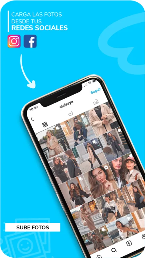 Sube 49 de tus fotos favoritas, puedes elegir de Facebook, Instagram o tu carrete.