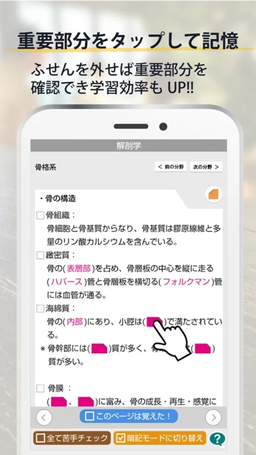 国試黒本アプリは、試験に出やすい重要部分を赤文字で表記し、さらに記憶が苦手な方でも自然に覚えられるよう"ふせん"が隠れています。