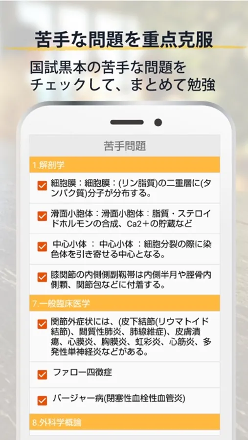 国試黒本アプリでは、勉強していて覚えられなかった部分、もう一度復習したい部分などがあった際に「苦手チェック」をすることができます。