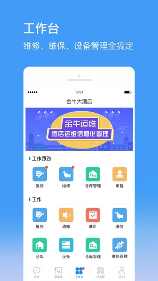 金牛运维是专为酒店、医院、政府大楼、学校等大型公共建筑的企业定制打造的一款集工作沟通、维修、维保、仓库管理、组织管理于一体的设备运维方案;致力于为提升企业设备运维效率、实现无纸化工作协同、降低企业人力成本。