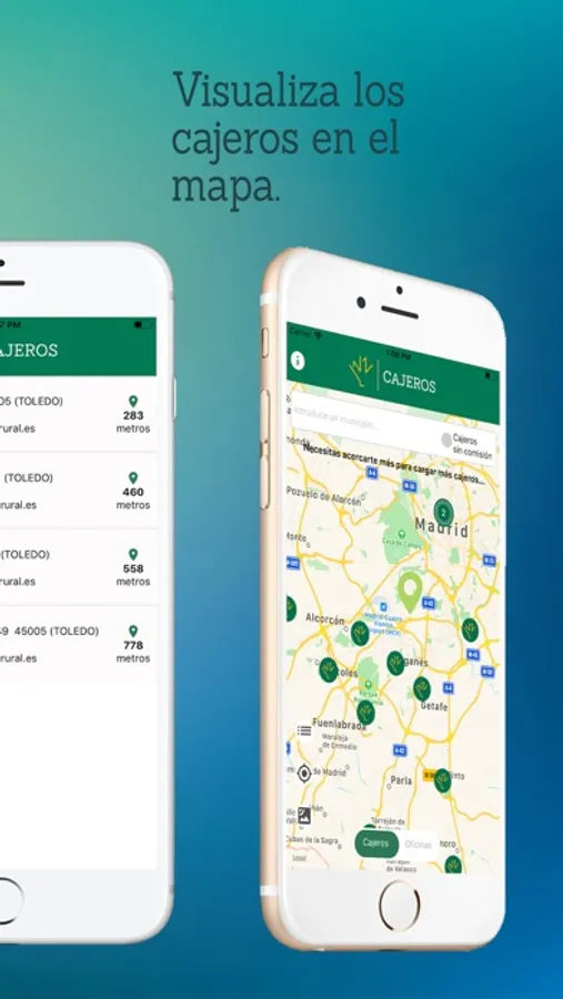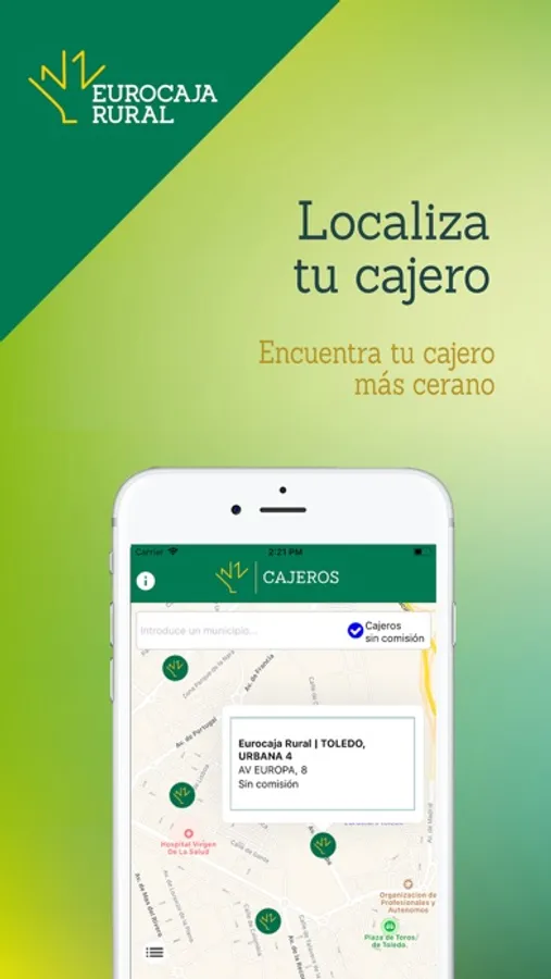 La búsqueda de cajeros automáticos localiza y visualiza en un mapa los cajeros propios de Eurocaja Rural y del resto de entidades, advirtiendo de la comisión que ésta entidad aplica en las retiradas de efectivo