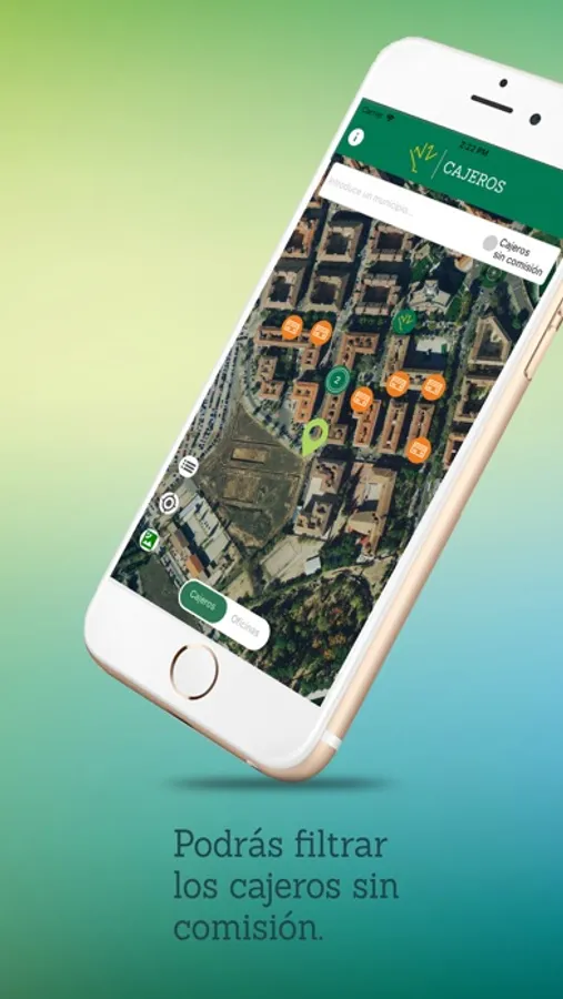 En la barra de búsqueda se puede filtrar por municipios, al hacer click en uno de ellos, el mapa se ubica en ese municipio con todos los cajeros disponibles. Dentro de la búsqueda se puede filtrar por cajeros sin comisión