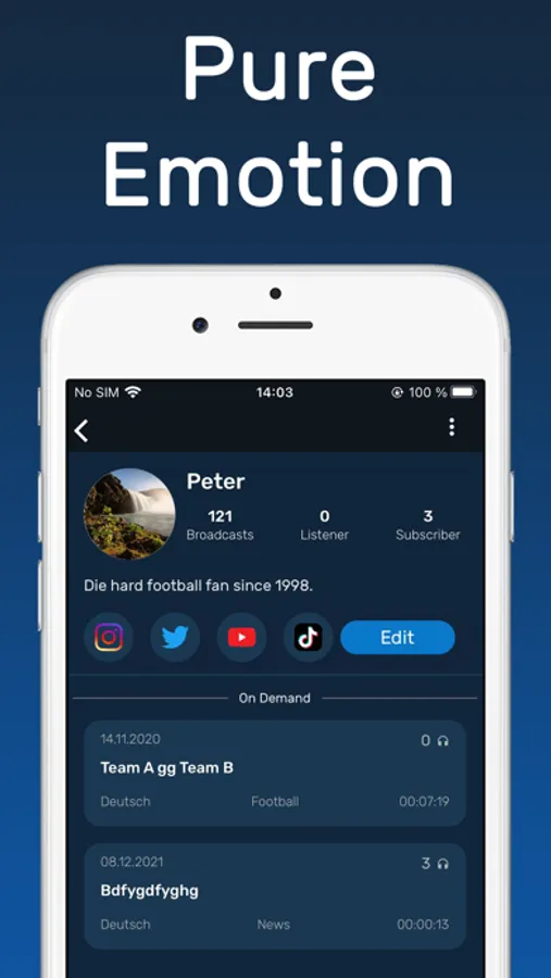 You would miss the match of your favourite club? You would rather listen to a commentator who is a fan of your club? mycrocast offers you THE solution. Never miss a game again or get upset about the reporter. Never again follow a boring live ticker. With mycrocast you choose your commentator. A radio from fans for fans, with the full measure of emotions.