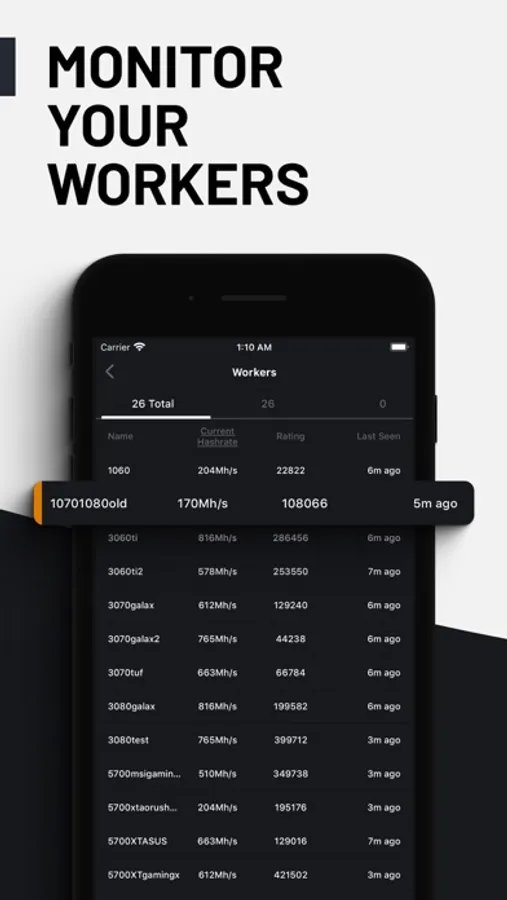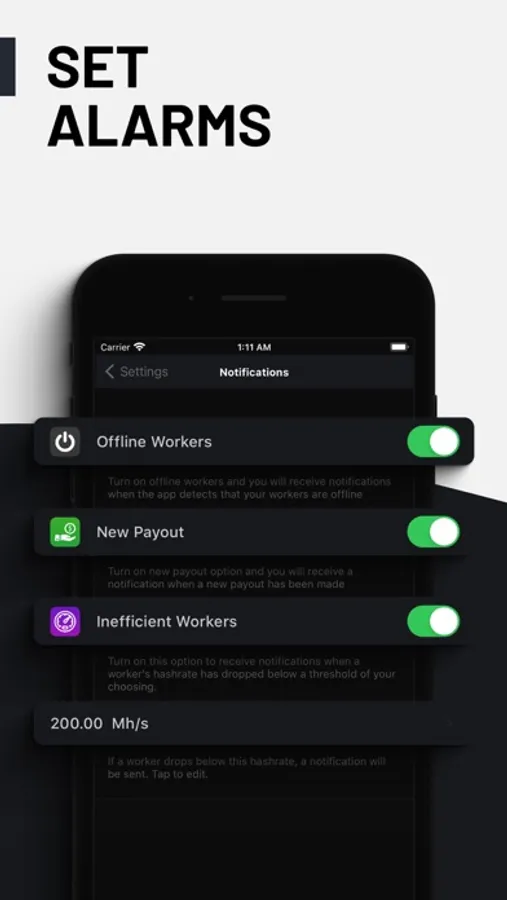 - receive notifications when a worker has gone below a hashrate of your choosing