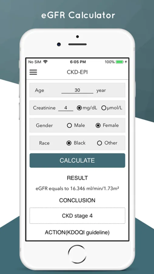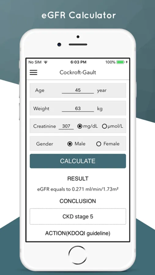 "eGFR Calculator" will interpret the Glomerular Filtration Rate (GFR) result and determine the stage of Chronic Kidney Disease (CKD). "eGFR Calculator" also provides recommended action based on staging of Chronic Kidney Disease (CKD). "eGFR Calculator" has a friendly user-interface. User can shift between the formulas in a click (e.g. Cockroft-Gault to MDRD) and choose the unit of serum creatinine easily between mg/dL or micromol/L.
