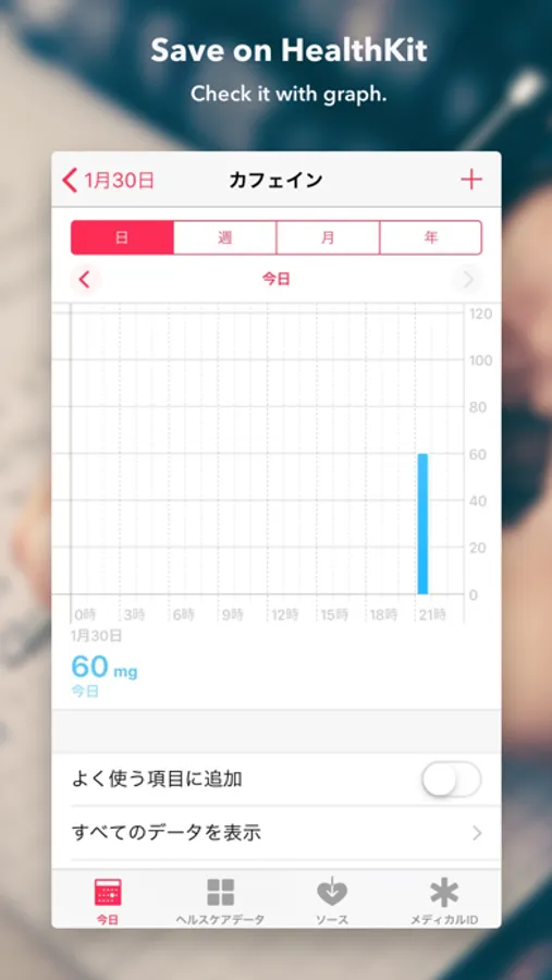 iPhone のヘルスケアにカフェイン摂取量を保存するのでヘルスケアへのアクセスが必要になります。