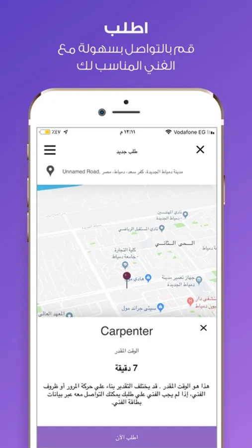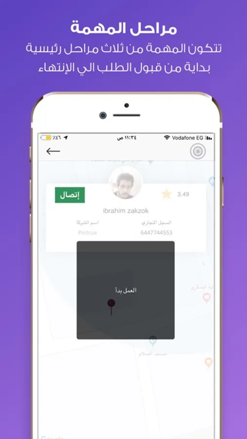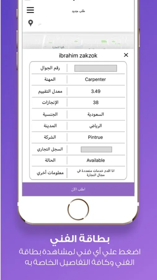4– تواصل بسهولة وإبدأ الطلب مع أي فني عن عبر التطبيق بسهولة أو عن طريق رقم الهاتف الموضح له.