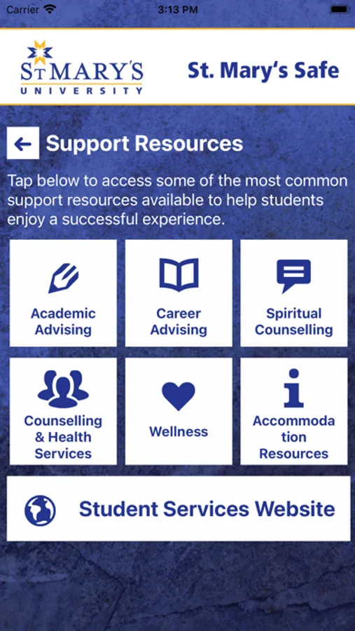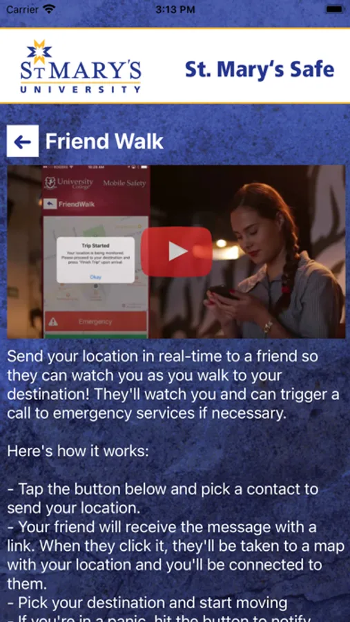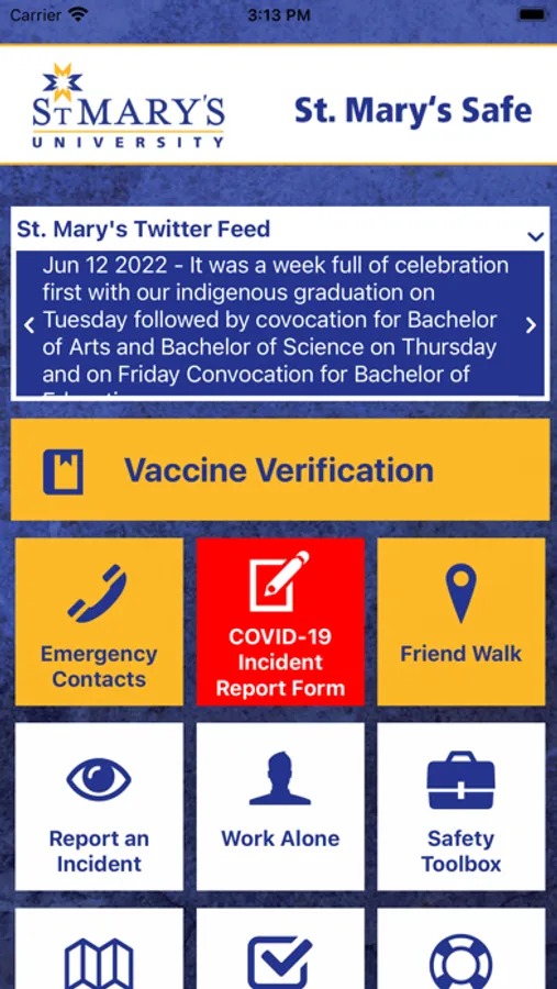 St. Mary’s Safe is the official safety app of St. Mary’s University Calgary. It is the only app that integrates with St. Mary’s University's safety and security systems. Safety and Security has worked to develop a unique app that provides students, faculty and staff with added safety on the St. Mary’s University campus. The app will send you important safety alerts and provide instant access to campus safety resources.