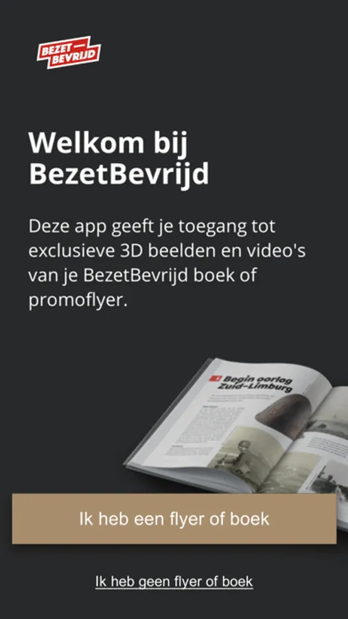 Welkom bij de BezetBevrijd app! Deze app maakt gebruik van Augmented Reality om video’s en 3D modellen uit de boeken van BezetBevrijd te onthullen. Zo kun je een Sherman Tank op je boek laten verschijnen en alle details van kortbij bekijken. Ook zijn er bij de hoofdstukken foto’s te scannen waarna originele beelden uit de Tweede Wereldoorlog te zien zijn.