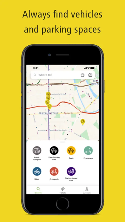Jelbi is your mobility app for Berlin's public transport, taxi, and sharing services. Whether bus, train, scooter, bike, car, moped, or cab, your unlimited mobility in the capital is just a few clicks away. Jelbi bundles all services in just one app. Buy public transport tickets or use the services of our mobility partners: Miles, Sixt share, Tier, Voi, Lime, Nextbike, Emmy, Bolt and Taxi Berlin. With the BVG Jelbi app, you have access to a fleet of 70,000 vehicles in Berlin.