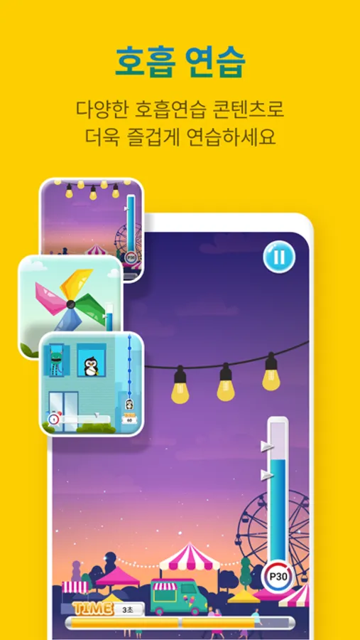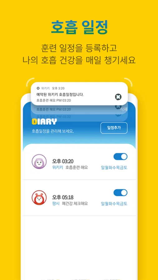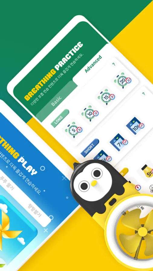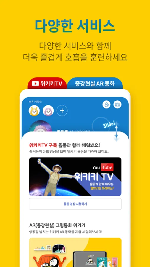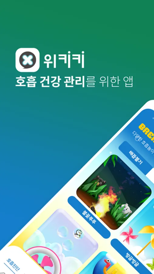 You can also meet penguin, bear, rabbit, and monkey friends that you saw in the Wikiki storybook in the Application. Children can choose, register and play their favorite characters, and they can enjoy blowing like characters in the story while it brings full amount of oxygen to their precious brain and body. In the play diary function, children can record the photos, feelings, and training of the day.