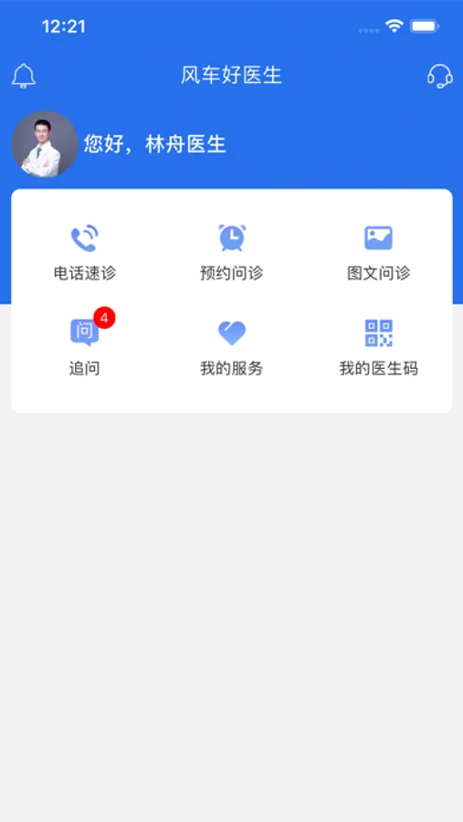 【首页】首页包含电话速诊、图文问诊、追问、医生码、我的服务、预约问诊