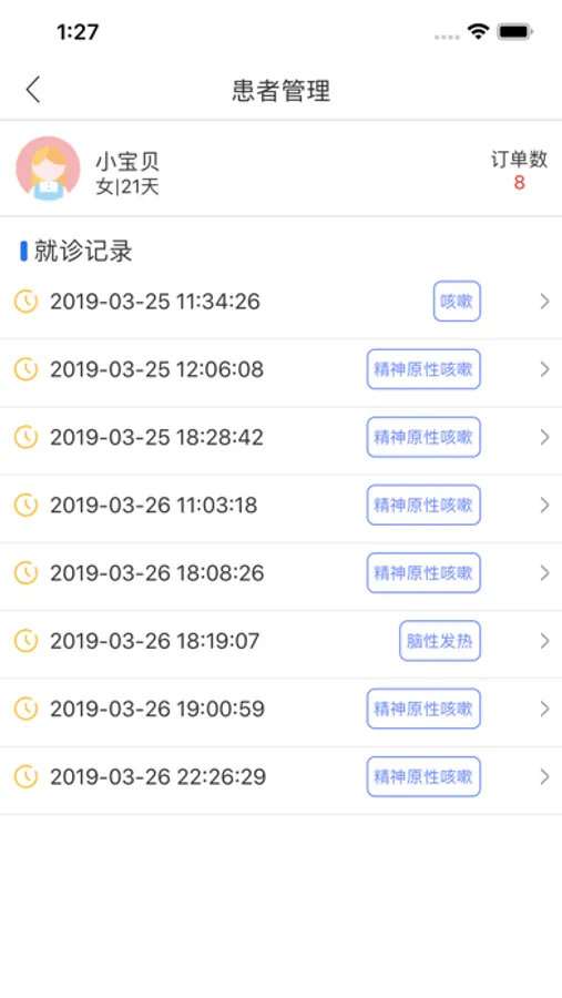 【患者管理】医生在线回答过的患者,都会在患者管理下呈现,医生可查看患者的历史就诊记录,方便医生做快速的诊断