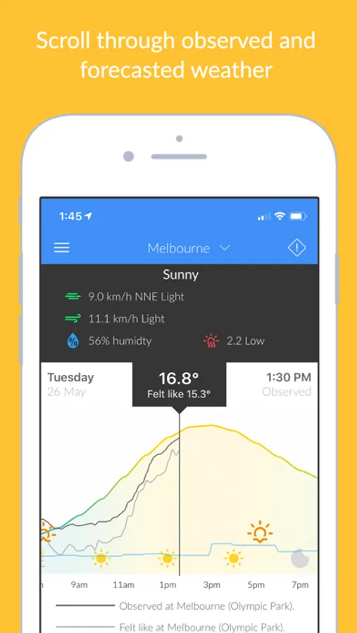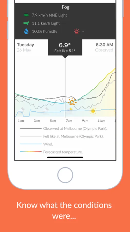- Scroll through a 7 day timeline of observed and forecast conditions