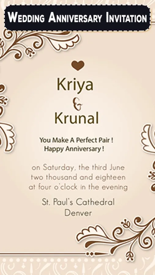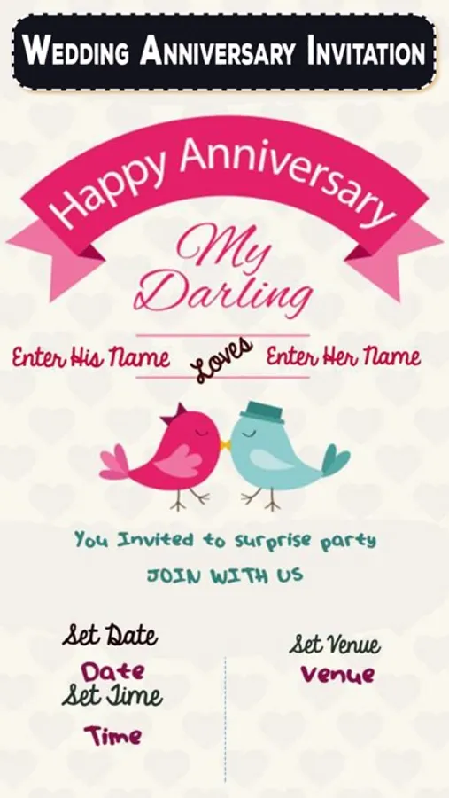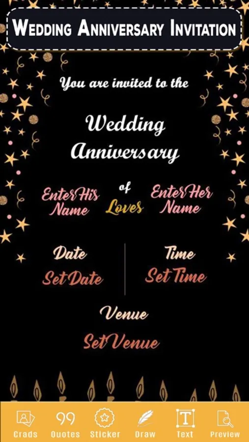 Full Pack of Wedding Anniversary Invitation Maker App allows you to design Cute and Beautiful unique style Wedding Anniversary Invitation cards to invite your friends family members guests and relative to Wedding Anniversary party.