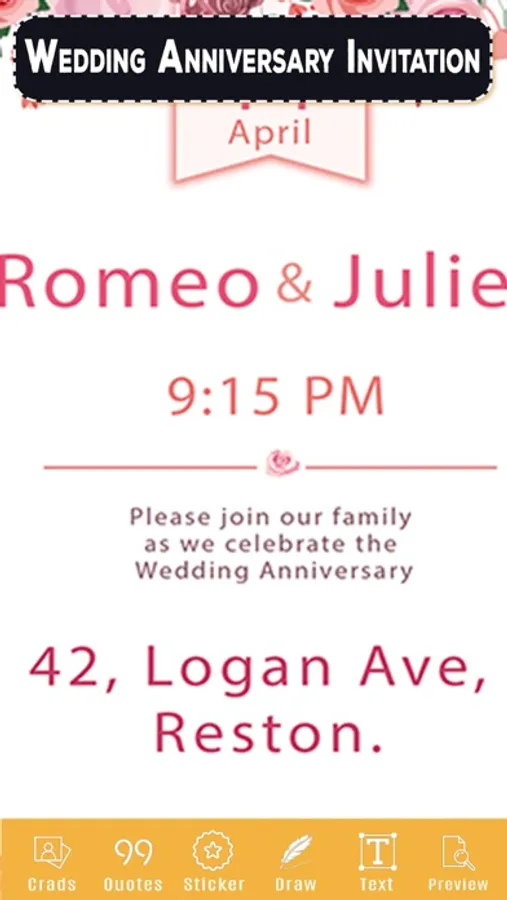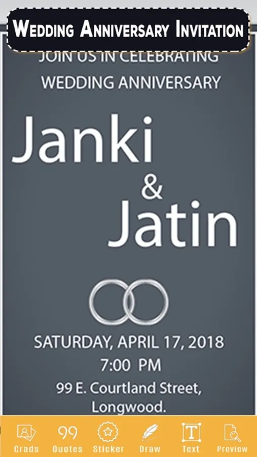 Wedding Anniversary Party Invitation Card Designer app allows you to share designed Party invitations on facebook twitter Google whatsapp or Gmail in just single Tap.