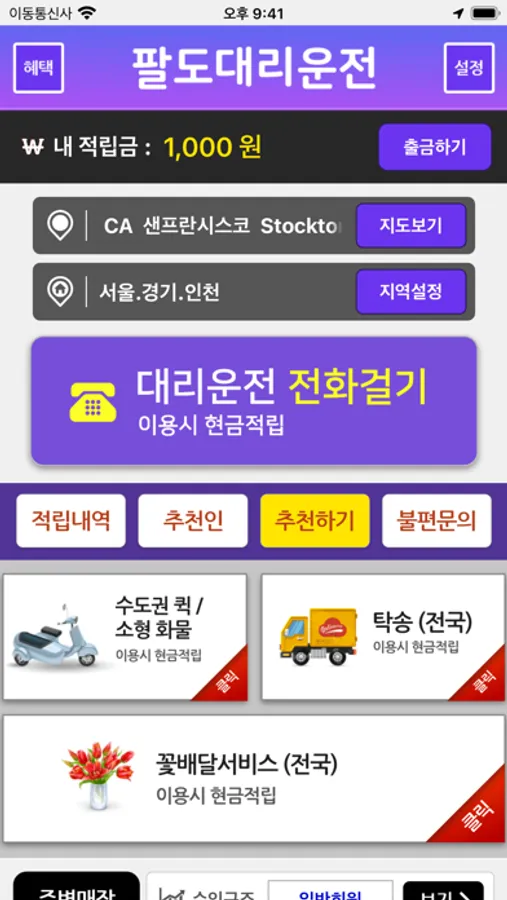 * 적립식 대리운전 팔도대리운전 앱입니다. 앱 하나로 대리운전,퀵,탁송,꽃배달을 모두 이용하실수 있습니다.