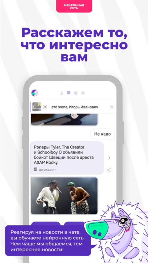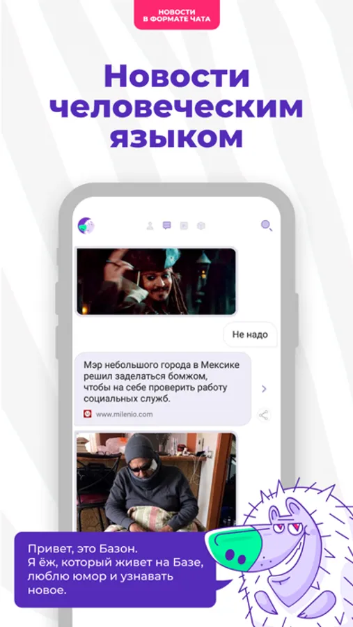 Виртуальный помощник Базон – сердце нашего приложения. Это ваш новый друг, который несколько раз в день присылает только интересные вам новости, показывает смешные видео и с юмором объясняет сложные вещи.