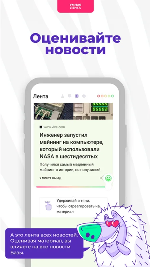 Рекомендательная лента (свайп влево) умна и информативна. Выражайте свои эмоции и влияйте на все новости «Базы». А раз в месяц самые важные темы превращаются в интерактивные истории (iStory). Расследования, репортажи – теперь это не обязательно читать, в это можно играть! Узнавать новости России и мира, политики и общества теперь легко и даже весело.