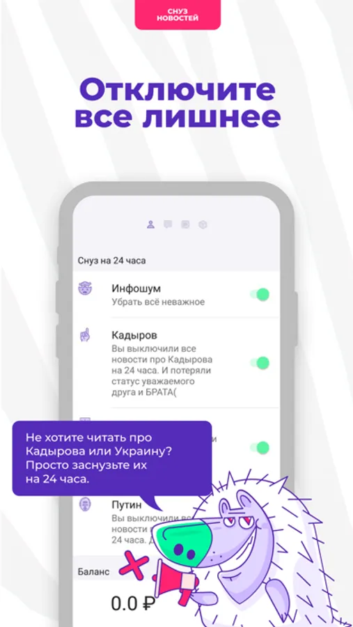 Достал информационный мусор или глупые заявления чиновников? Вы всегда можете отключить их ровно на сутки. Песков останется без своих комментариев, вы не услышите Путина и новостей из Украины, а перед Кадыровым не надо будет извиняться.