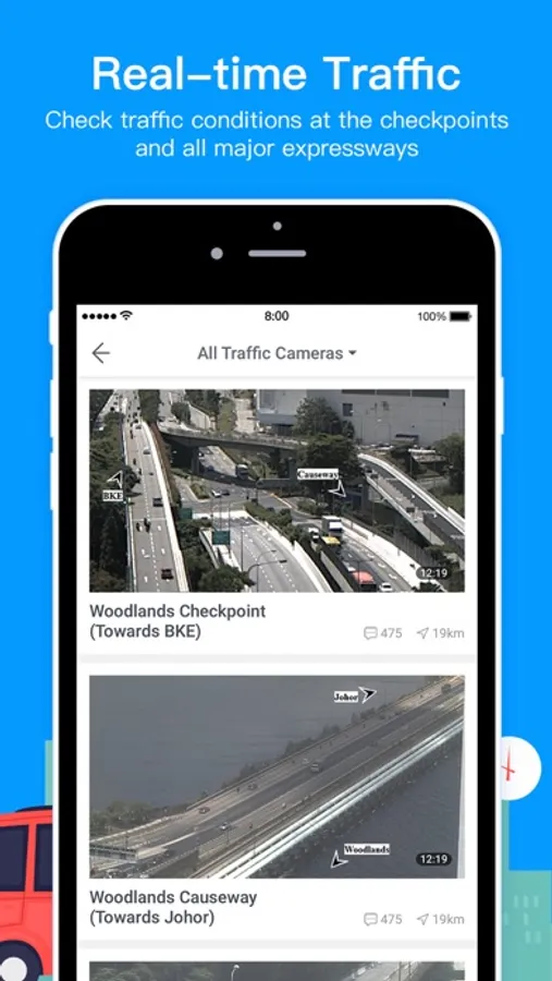 Check the real-time traffic conditions via traffic cameras. Available for the checkpoints and all major expressways.