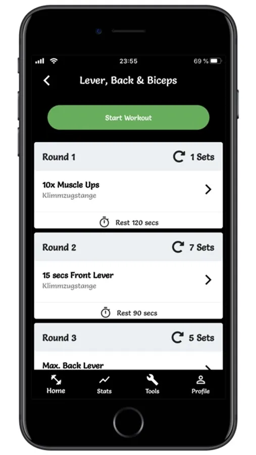 Ebenso kannst du dir demnächst aus verschiedenen Traingsplänen deinen eigenen aussuchen und so gezielt auf Skills, wie den Front Lever, Back Lever trainieren, oder generelle Traingspläne für Strength / Kraft, Kraftausdauer oder Ausdauer nutzen.