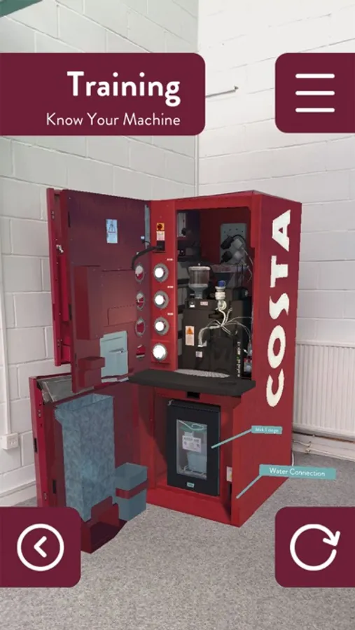 Using Augmented reality object recognition technology, the App will overlay digital information onto your real-life Costa Express machine. Just by holding your phones camera up to the machine, we will guide you through the whole troubleshooting process step by step.