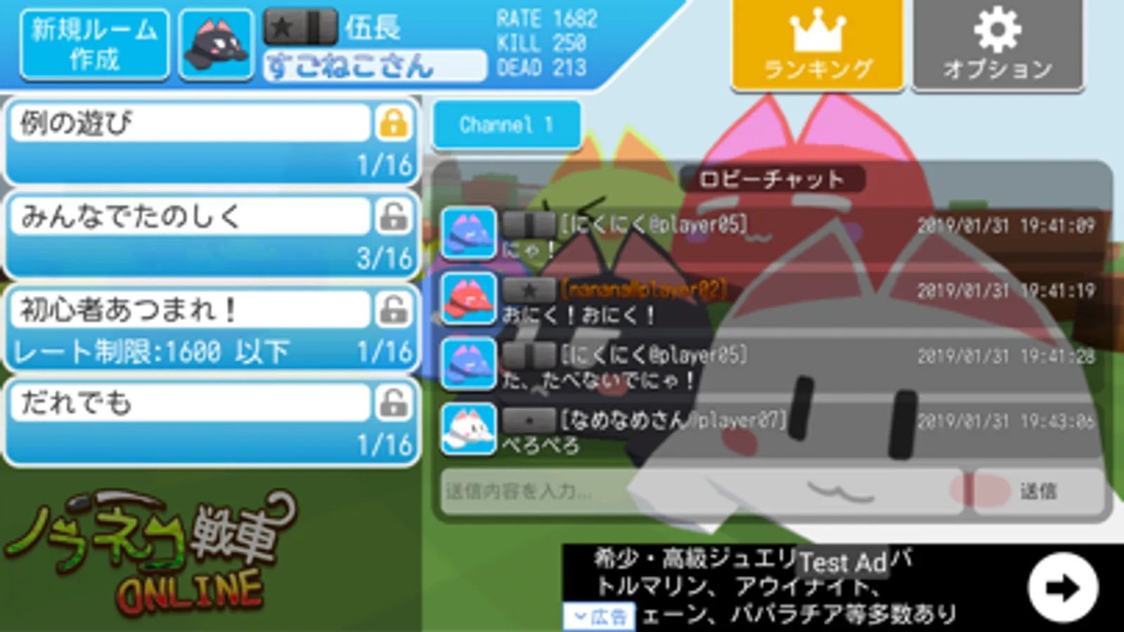 待ち合いロビーやゲームルーム内ではなんとチャットで他のノラネコ戦車とお話しもできちゃう。