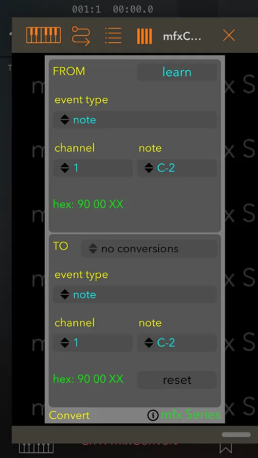 mfxConvert is a plugin for converting MIDI events in real time. It can be used for simple channel, note or controller remaps. However, it can also handle sophisticated conversions of event types, for example pitch bend to controller or note velocity to channel pressure. See below for the supported conversions.