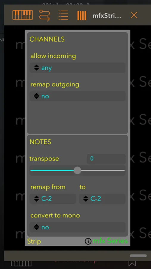 Some of the most commonly used MIDI manipulations in one handy package. This is MidiFire's Channel Strip module in AUv3 format.