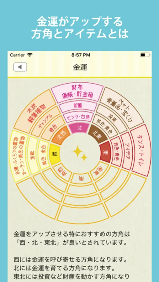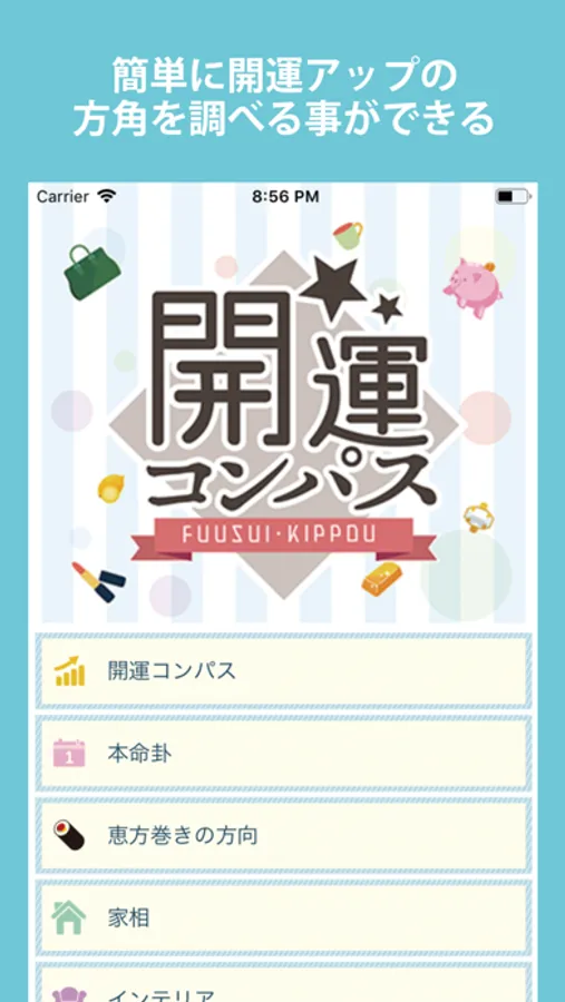 金運や恋愛運など気になる運気を上げるための方角やラッキーカラー・ラッキーアイテムを教えてくれて生活に取り入れることが出来ます。