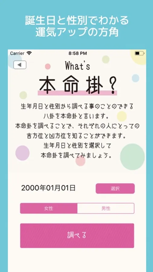 当アプリは、その人が生まれ持った卦数をもとにラッキーな方角を表示します