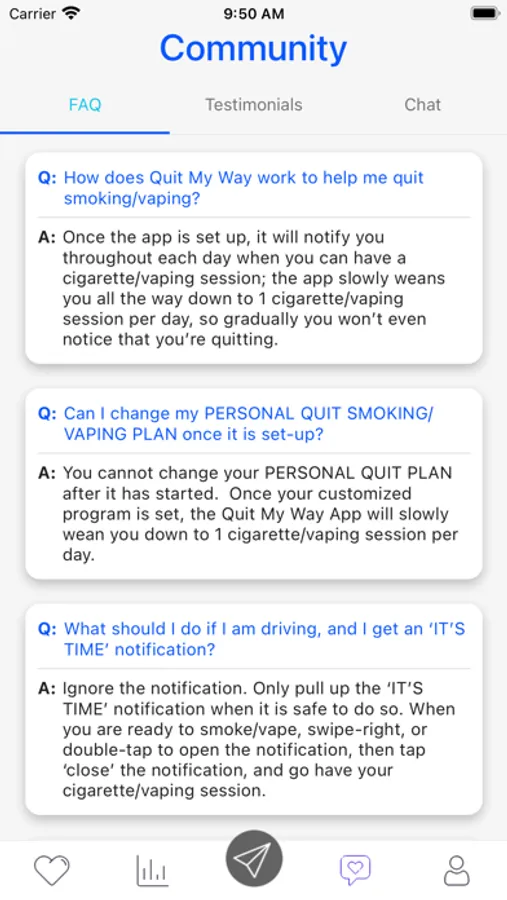 We've helped customers worldwide achieve their goals of living a healthy, nicotine-free life by educating, motivating, and supporting them through the app. Your personalized Quit My Way program provides you with real-time feedback on how many cigarettes or vaping sessions you've had for the day, how many you have left, as well as a supportive message every evening to keep you motivated and on track.