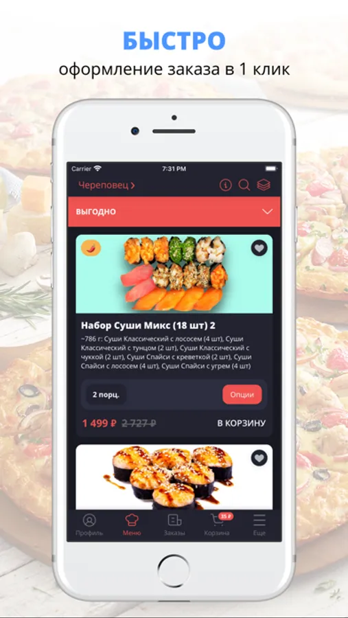 Суши Фудс - доставка еды в г. Череповец. Всегда в нашем меню - суши, роллы, пицца. Только вкусные суши и роллы из под ножа. Быстрая, бесплатная доставка! Закажи и убедись!