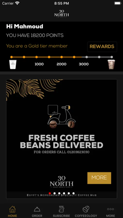 Earn rewards points every time you place an order and redeem your points for prizes from our menu and see your points accumulate with our unique animated coffee cup.