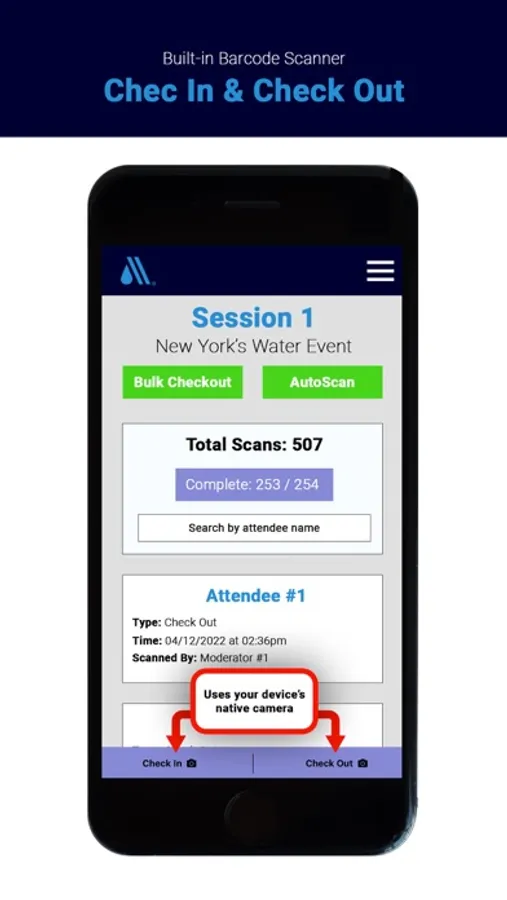 At check in, hand out badges to conference attendees. Then, simply use the app to open your device's camera, check in and check out attendees from sessions they attend by scanning their barcode. It's that easy!
