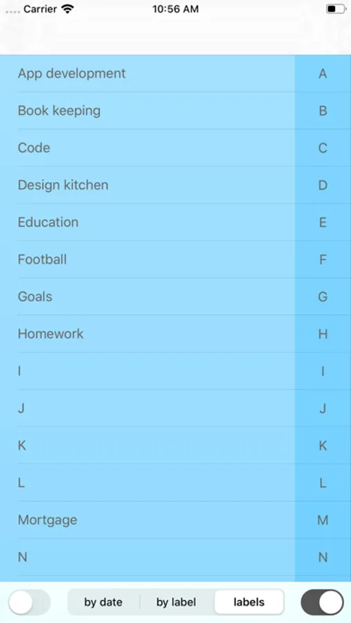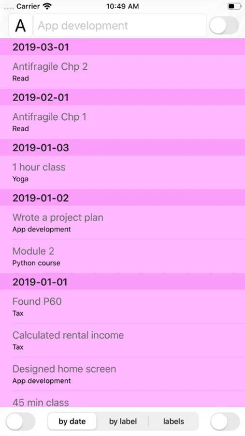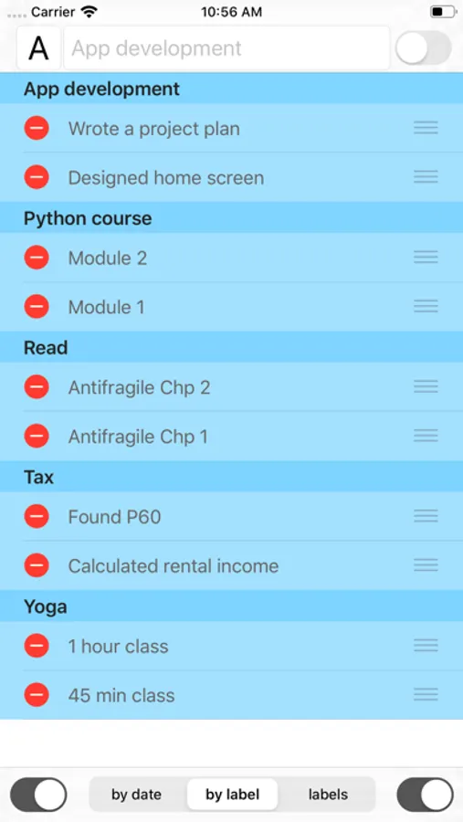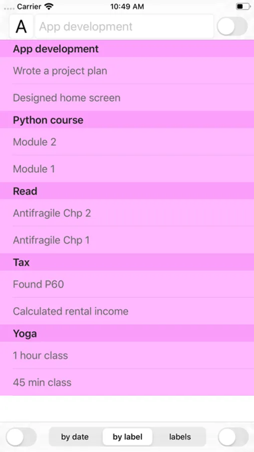 The app is simple as possible with only three switch buttons, one to enable editing, one to change colour, one to record items as beginning done yesterday rather than today, just in case you remember something the following day.