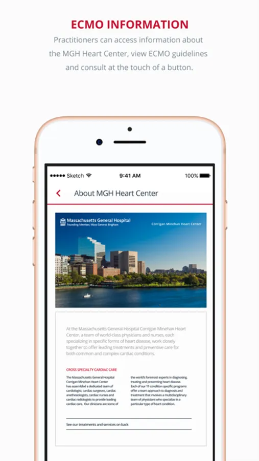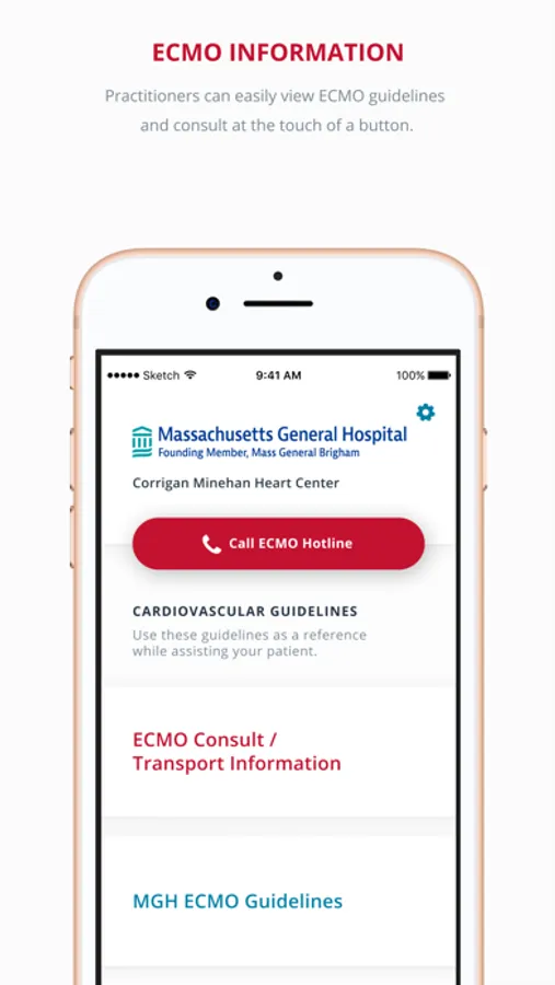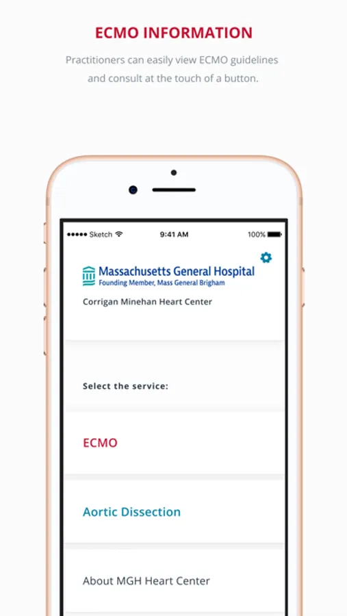 This App provides guidelines from the Massachusetts General Hospital (MGH) for clinical care of patients requiring extracorporeal membrane oxygenation (ECMO) or suffering from Aortic Dissection. The App also provides one-touch telephone access to the appropriate MGH physicians on call for assistance with these patients. Primary physicians and first-responders can use the App to refer patients directly to the MGH Heart Center for life-saving emergency care.