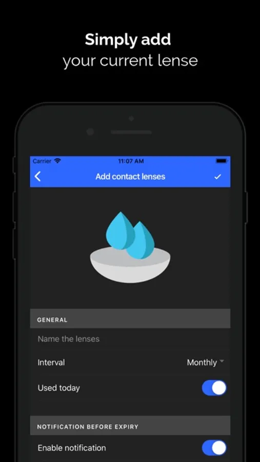 - If you wish, the app can notify you via push notification before the contact lenses expire (1 day, 3 days or 7 days before, depending on the setting).