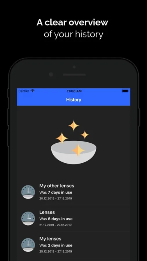 - The data of the lenses already worn are stored and displayed. So you always have a clear overview when you have worn lenses and for how long.