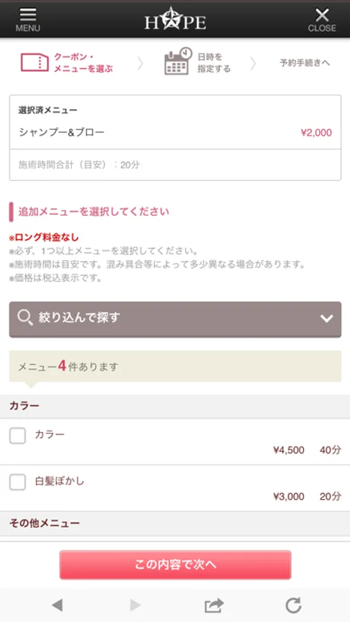 ご希望の日時・メニューを選択してご予約ください。