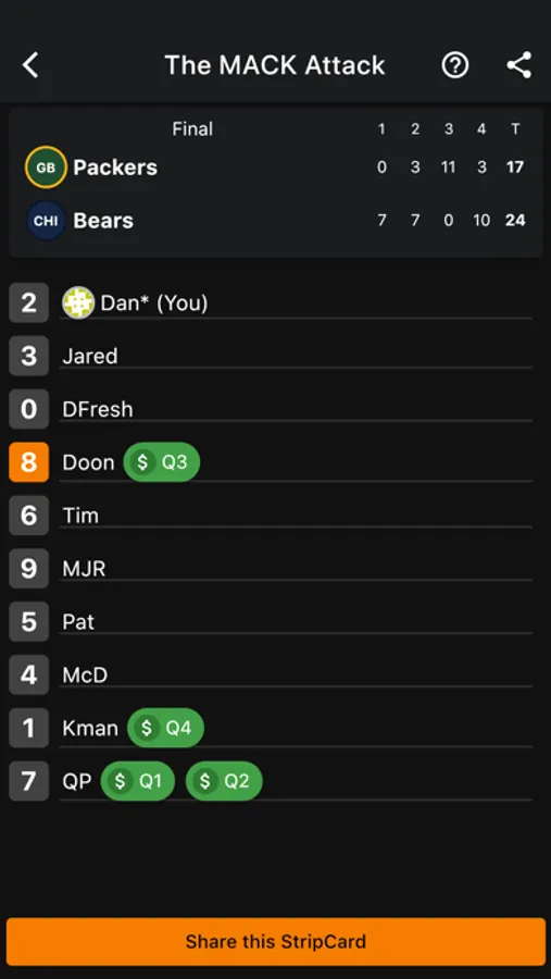Choose your place in the StripCard and wait for the event to begin. The numbers are hidden until the event begins. Enjoy some friendly competition as you watch the game together and hope you are in the winning position!