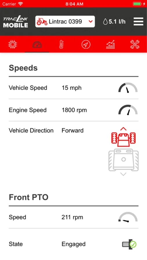The app keeps you informed about the status and speed of PTOs, detects the position of the rear and front hydraulics, and analyzes driving speeds and lifting and pulling forces.