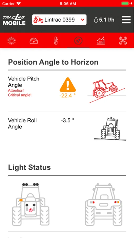 Tractors do a lot of work on steep inclines. To detect risky situations in a timely manner and prevent dangerous downhills, the app provides useful information about the vehicle position and warns of overly steep angles in plenty of time. In addition, all of the vehicle's headlight conditions are clearly displayed.