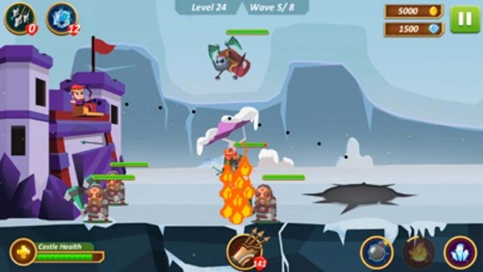 A challenging game, Magic War - Castle Defense is based on simple bow and arrow archery game physics. To play the game, just pull back the bow with your finger, aim at the enemy and release the arrow to shoot. You have limited arrows for each level, so aim perfectly! Make sure you have a good strategy to clear each level!