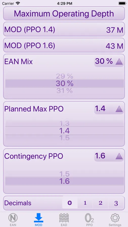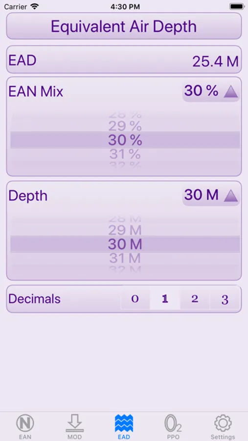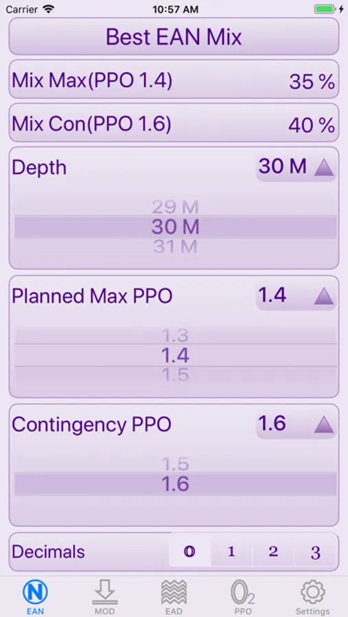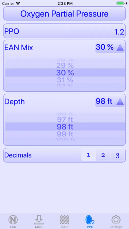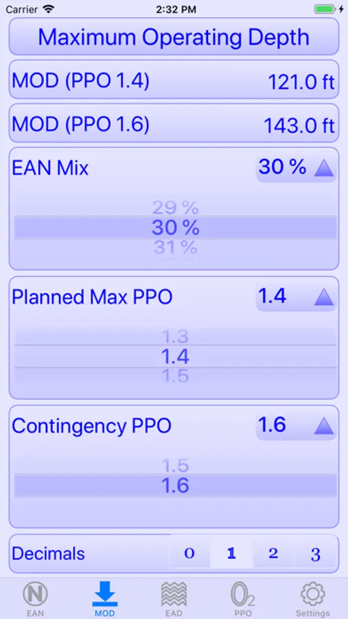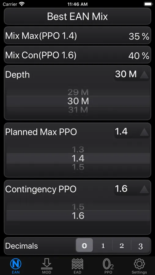 All the calculations allow the user to set the number of decimals to display for the Nitrox calculation. This allows for increased bottom time when using a dive computer that permits the use of decimal inputs.