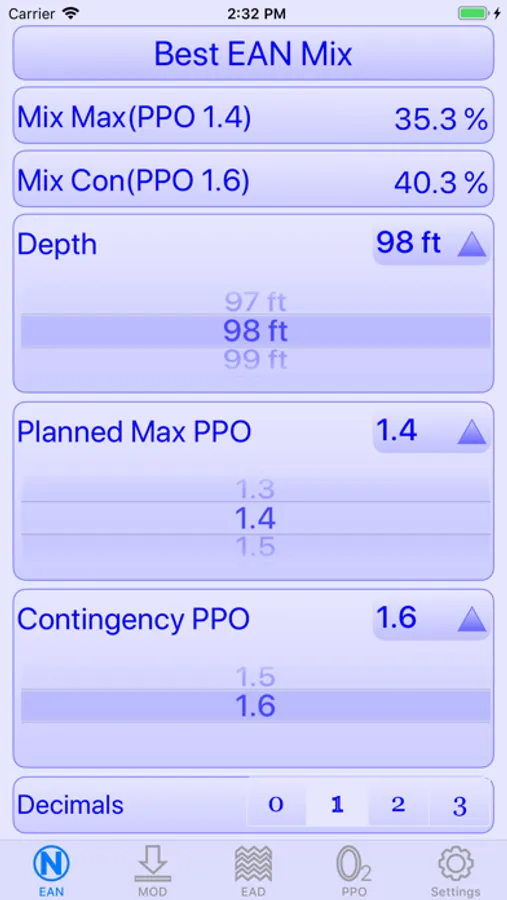 The best mix view calculates the best EAN Nitrox mix for a specific depth and specific oxygen partial pressure.