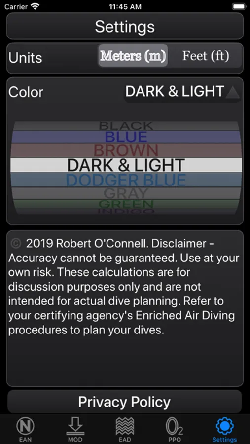 Nitrox helper can be customized to use feet (imperial and U.S. customary measurement system) or meters (metric system).