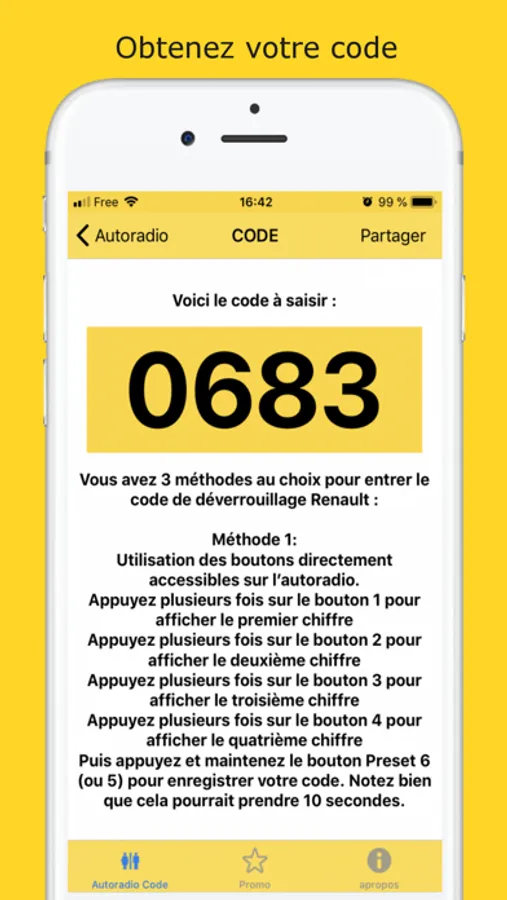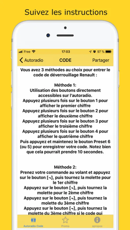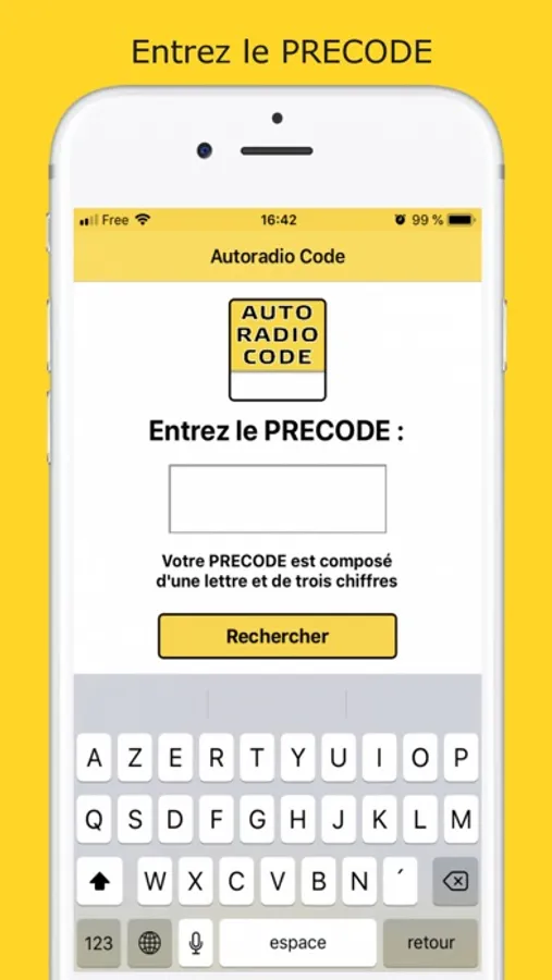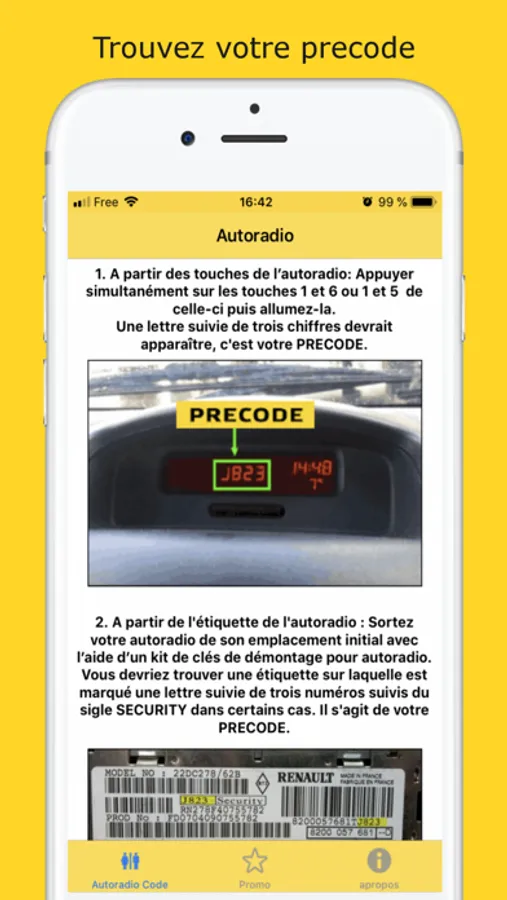 1. Enter the precode of your car radio (it is on the back of your car radio: follow the instructions in the application to easily find the precode)