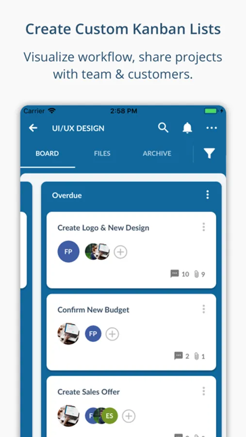 - Custom Kanban boards: create multiple custom #Kanban lists and visualize project progress.